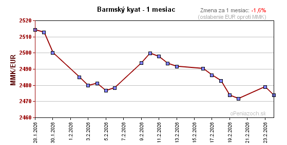 | Kurz k 24.2.2026 2 473,82 MMK za 1€ (0,00040 EUR/MMK) | ![]() | -5,240 MMK -0,21 % |