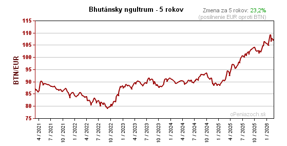 | Kurz k 26.2.2026 107,34 BTN za 1€ (0,00932 EUR/BTN) | ![]() | 0,10250 BTN 0,10 % |