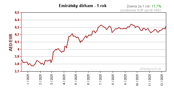| Kurz k 12.12.2025 4,310 AED za 1€ (0,23199 EUR/AED) | ![]() | 0,00620 AED 0,14 % |